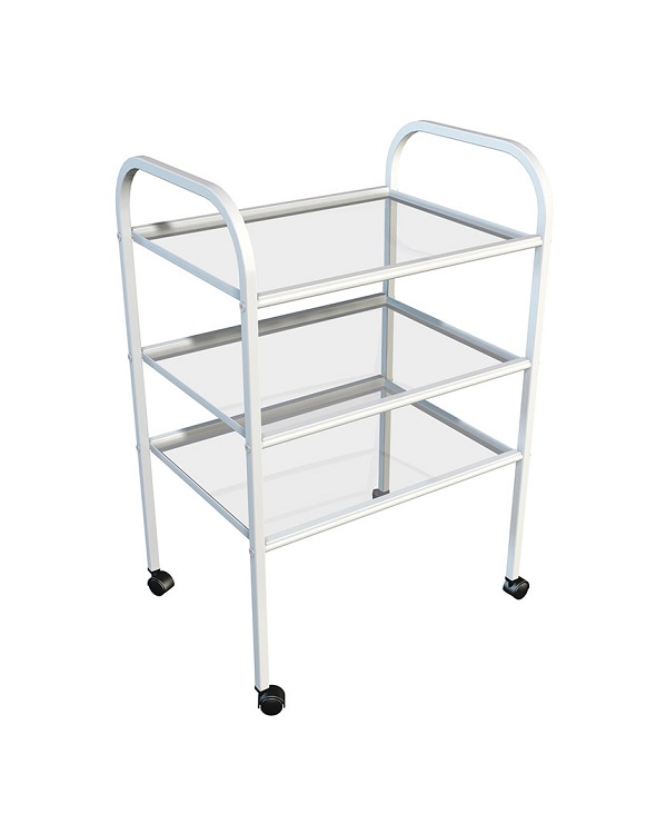 Столик комплектуется 3 стеклянными полками, 4 резиновыми колесами, два из которых снабжены стопорами. Диаметр колес 50 мм.