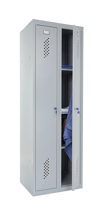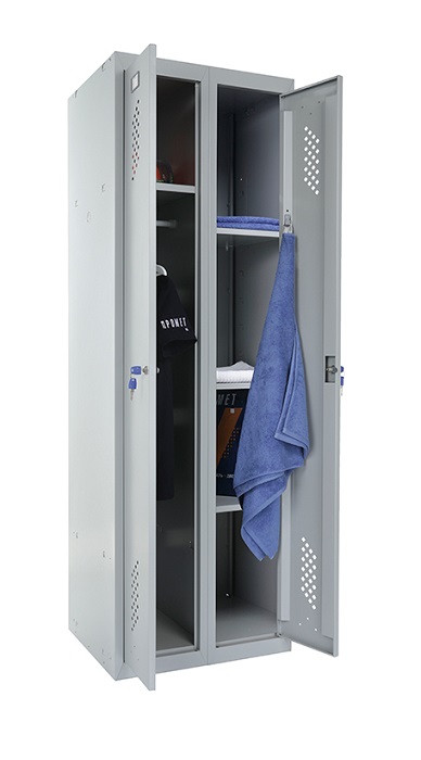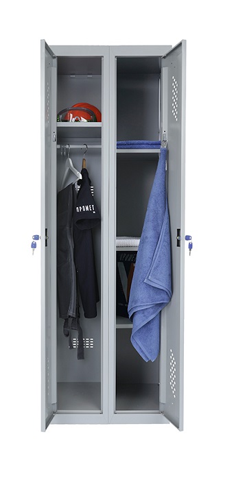 Шкаф МL 21-80U оснащен улучшенной вентиляцией на дверях и задней стенке. Шкаф разделен на две секции. Одна секция комплектуется полкой для головного убора и перекладиной для вешалок и крючками. Вторая секция комплектуется 4 полками.