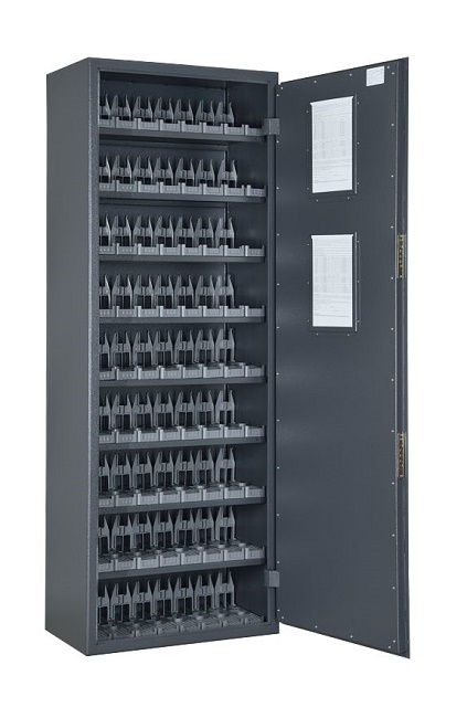 Сейф ОШ-72ПУ изготовлен из металла толщиной 3 мм. Комплектуется 8 съемными полками, универсальными подставками под пистолет. С внутренней стороны двери установлены 2 рамки под опись.