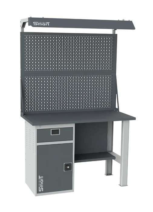 В комплектацию верстака входит: столешница 1280 SMART, полка/стенка 625 SMART, тумба SMART 1-1, опора SMART, два перфорированных экрана SMART, комплект освещения SMART. Столешница выполнена из фанеры толщиной 27 мм со стальной окрашенной накладкой 1,2 мм. Опора сварная выполненная с применением высокоточного сварочного оборудования. Имеет нижнюю перекладину для усиления устойчивости конструкции. Размер опоры (ВхШхГ): 835х500х135 мм. Тумба SMART 1-1 комплектуется одной дверью, одним выдвижным ящиком. Выдвижной ящик тумбы оборудован телескопической системой полного выдвижения ящиков с фиксацией в закрытом состоянии (50000 циклов). Внутренняя стенка двери имеют универсальную перфорацию для размещения навесных элементов. Шаг квадратной перфорации (10 мм) - 38х38 мм, круглой (7 мм) - 25х38 мм. Возможна смена стороны открывания двери тумбы. Дверь закрывается центральным ключевым замком. Секретность замка 2000 комбинаций (2 ключа в комплекте). Перфорированный экран SMART имеет универсальную перфорацию (квадрат 10 мм c шагом 38х38 мм и круг 7 мм с шагом 25х38 мм) для размещения различного типа крючков и держателей инструмента. Цвет верстака: опора, корпус тумбы - серый Ral 7035, столешница, полка/стенка, лицевая панель тумбы, экран - графит Ral 7016. Поставляется в разобранном виде.