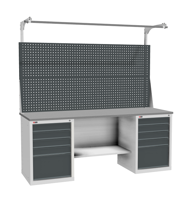В комплектацию верстака входит: столешница ВЛ-К 200, полка и стенка ВЛ-К, две тумбы ВЛ-К-015, два перфорированных экрана.