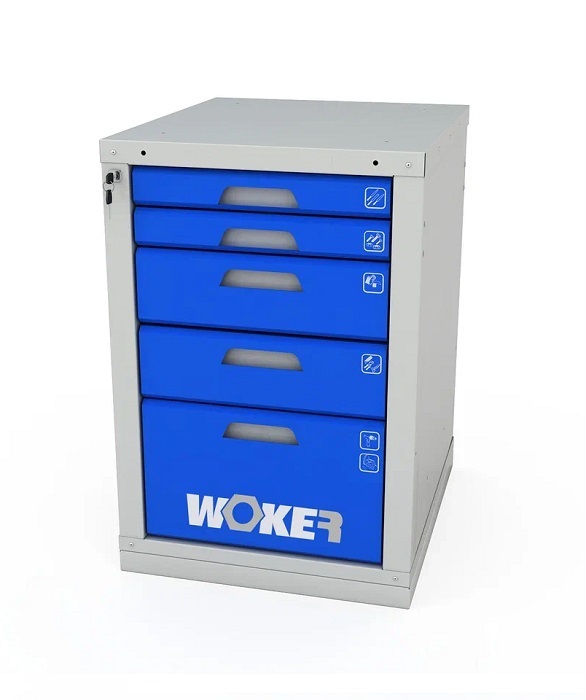 Тумба Woker 05 комплектуются 5 выдвижными ящиками (2 малых - 65 мм , 2 средних - 135 мм и 1 большой-275 мм). Полезный размер ящика: (ШхГ) 459х612 мм. Ящики комплектуются противоскользящими ковриками и набором наклеек с пиктограммами для маркировки содержимого ящика. Тумба закрывается на центральный цилиндрический замок (секретность замка 2000 комбинаций). Цвет: корпус верстака - серый Ral 7035, лицевая панель тумбы Ral 5005.