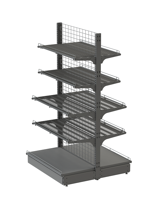 Островной стеллаж сетчатый предназначен для продажи продовольственных и непродовольственных товаров. Относится к основным стеллажам, которые используются в супермаркетах и магазинах самообслуживания. Сборно-разборная конструкция стеллажа позволяет менять конфигурацию: из линии островных стеллажей собирать линию пристенных стеллажей, собирать отдельно стоящие островные стеллажи, менять межполочное пространство, в зависимости от высоты товара, менять количество полок. Для завершения линии дополняется торцевыми стеллажами, фризами. Для размещения более тяжелых и габаритных товаров предусмотрена усиленная конструкция островного стеллажа со стойками 90х30 мм или 110х30 мм, а также усиленными полкодержателями.