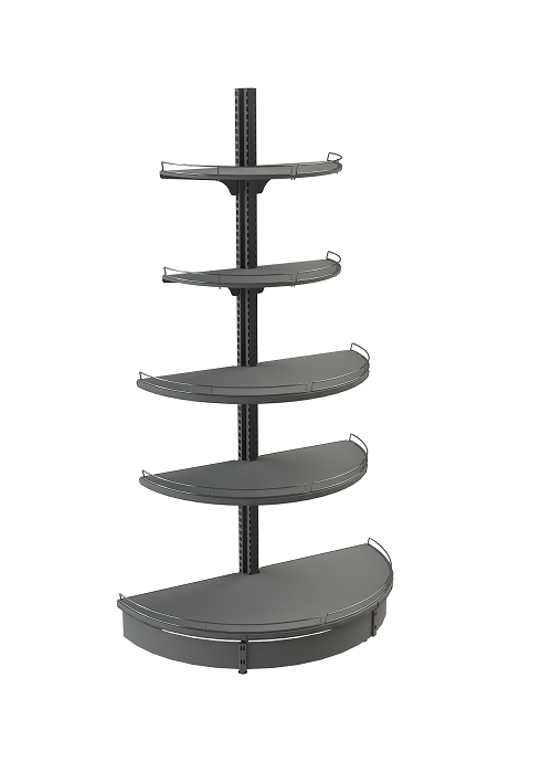Стеллаж торцевой с полукруглыми полками устанавливается на торец линии островных стеллажей и придает ей законченный вид, а также обеспечивает дополнительное место для выкладки товара. Конструкция торцевого стеллажа формируется на основе последней стойки островного стеллажа (на торце) при помощи наборного адаптера для установки полкодержателей. Не эксплуатируется как отдельно стоящий!
